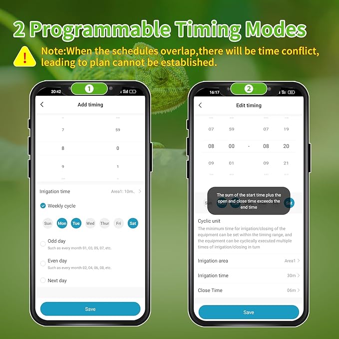 - Reptile Humidifier Cycle Timing System: The reptile humidifier features both a cyclic timing mode and a standard timing mode. The cyclic watering schedule allows you to set the watering range (start time to end time), watering duration, shut-off time, and watering frequency (days). In standard timing mode, watering occurs at specific times of the day.