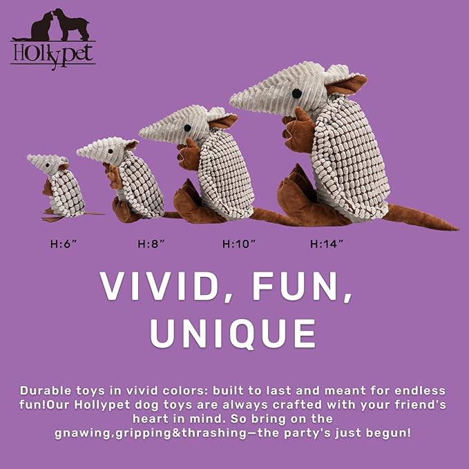 - Unique Sound - Hollypet Armadillo Squeak Toys (except 6 inch) make a sound that's not high pitched, but rather a unique and funny grunt sound that your furry friend will love. Unlike noisy bones, ropes, or other normal stuffed plush dog toys