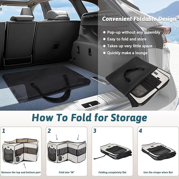 - 3-Second Setup & Travel-Ready:This lightweight pet playpen comes with a carrying bag for easy transport, sets up quickly and folds flat, includes two pockets and a water bottle holder, ideal for travel and camping with no assembly required
