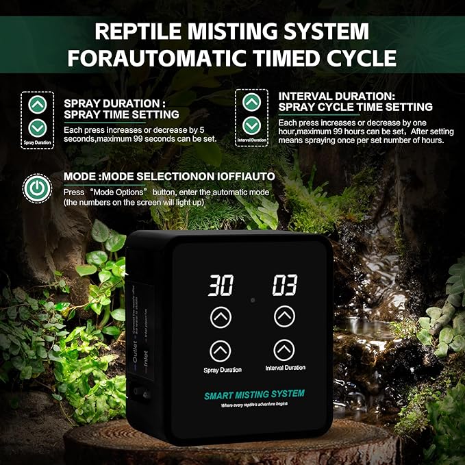 - SMART TIMING SETTING - Reptile Humidifiers Misting System only 3 buttons to easy setup. Press the "Spray Duration" once to increase 5 seconds. Starting from 5s, 10s, 15s - 60s; Press the "Stop Duration" once to increase 1 hour. Starting from 1H, 2H, 3H ... 24H, so cycle.