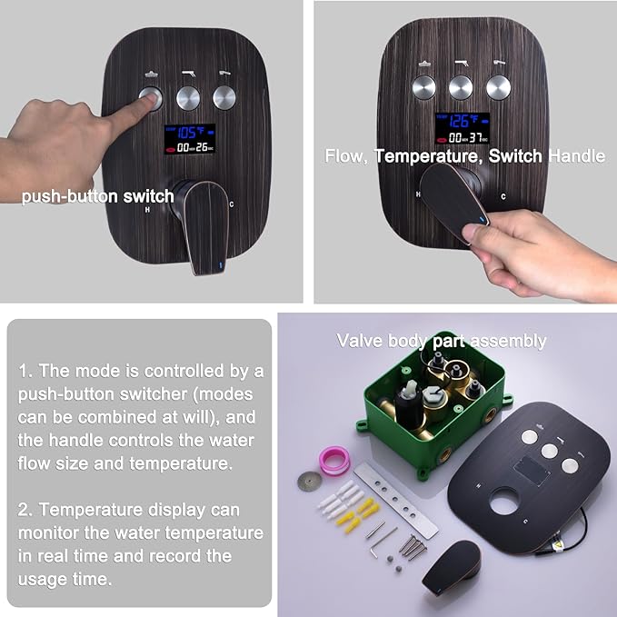 - Backflow Prevention & Stable Flow: Pressure-balancing technology prevents sudden temperature changes and ensures consistent water flow. There-mode push button and handle controls flow and temperatur
