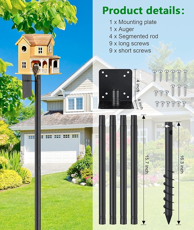 - Easy to Assemble: Bird house poles for outdoors bottom section has an auger attached to it that you need to screw into the ground as far as it would go and then attach the rest of the sections to it, just install the top platform at the end.