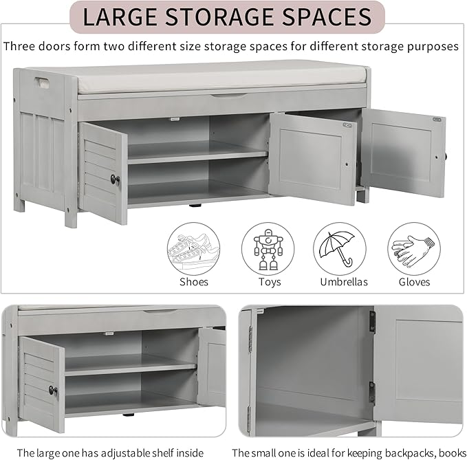 Storage Bench with 3 Shutter-Shaped Doors, Wood Shoe Bench with Removable Cushion and Hidden Storage Space for Entryway, Living Room, Hallway 43.5" L*16" W*18" H (Gray Wash Pine)