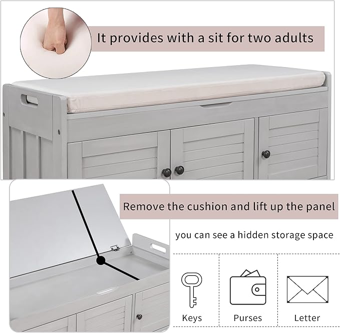 - Perfect for Family Use: Compared to the traditional type of storage bench, our storage bench is designed as 3 functions in one bench. It provides with a sit for two adults, two storage cabinets for multiple storage purposes. Remove the cushion and lift up the panel, you can see a hidden storage space which is extremely private. It's a good place for putting purses, keys and other on-the-go small items that are neatly contained. Hidden storage space dimensions: 40.6''L x 14.4''W x 1.5''H.