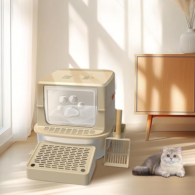 - WITH FOOTBOARD, LITTER SCOOP & DOUBLE LAYER LITTER MAT: The filter pedal allows kittens, older cats or short-legged cats to easily enter and exit the litter box for cats. Combined with the litter mat, it can cleverly capture the cat litter scattered by the cat and recycle it, maximizing the litter saving and keeping the floor clean. The included wall-mounted cat litter scoop makes cleaning the litter box a breeze.