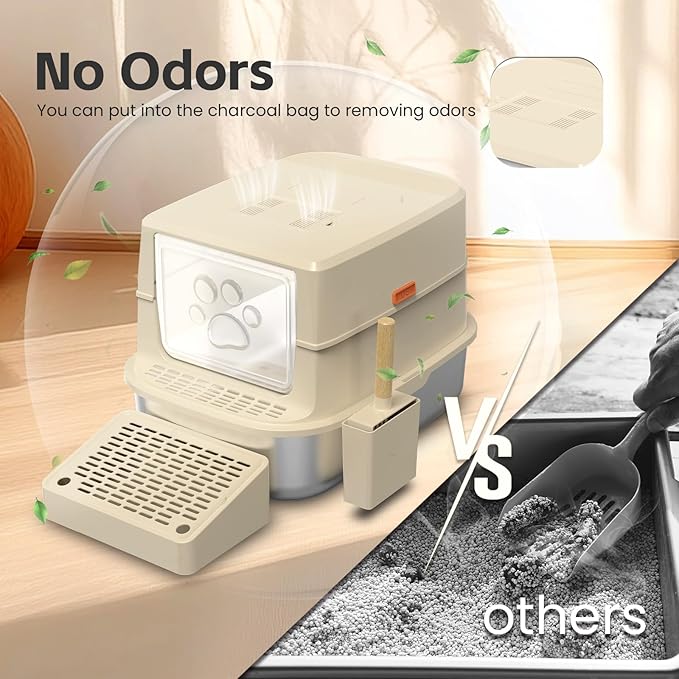 - CARBON FILTER - EASY DEODORIZATION: The covered cat litter box is equipped with a charcoal filter, which can be filled with activated charcoal bag to absorb odors in the litter box. The non-porous nature of the metal cat litter boxex also prevents odor from remaining. The perfect combination of it and the filter housing reduces the prevalence of unpleasant odors in the room, ensuring that the cat has a fresh and comfortable space, and you will no longer have to deal with unpleasant odors.