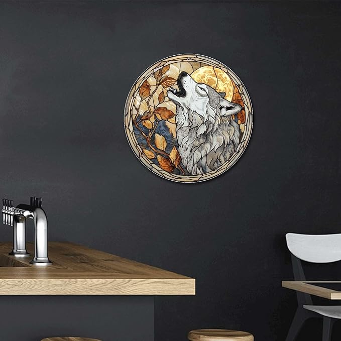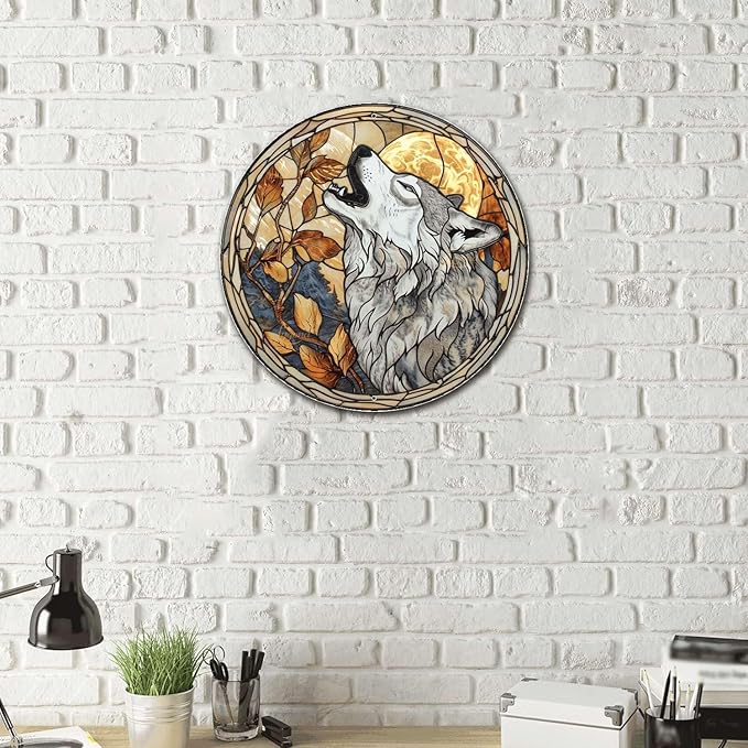 Lygond Metal Sign Tin Sign Circular Stained Glass Gray Wolf Funny Outdoor Decor for Gift 8×8 Inches