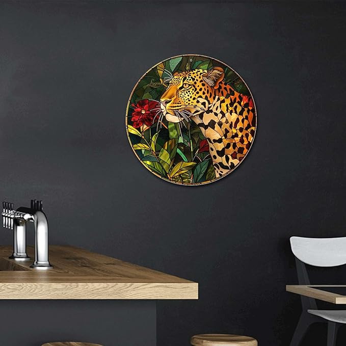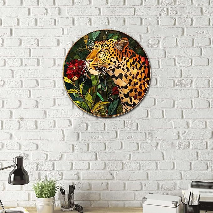 Lygond Metal Sign Tin Sign Circular Stained Glass Leopard Home Decor For Restaurant 8×8 Inches