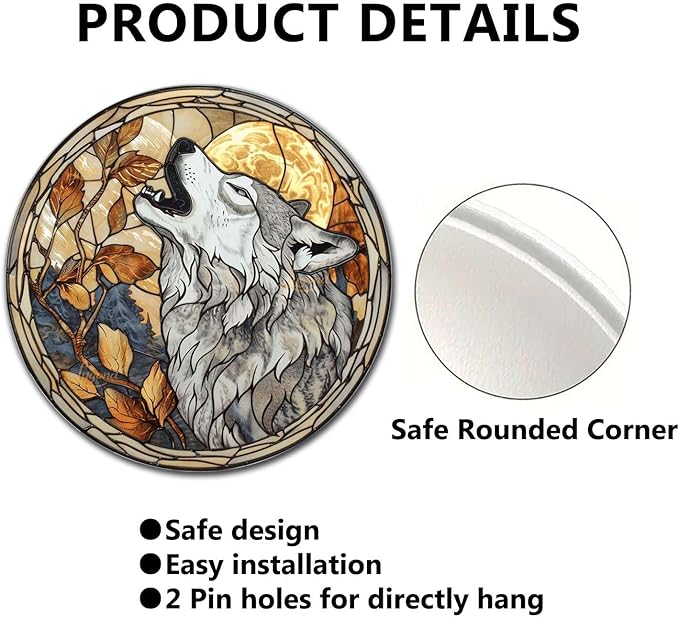Lygond Metal Sign Tin Sign Circular Stained Glass Gray Wolf Bathroom Signs for Home for Club 12×12 Inches