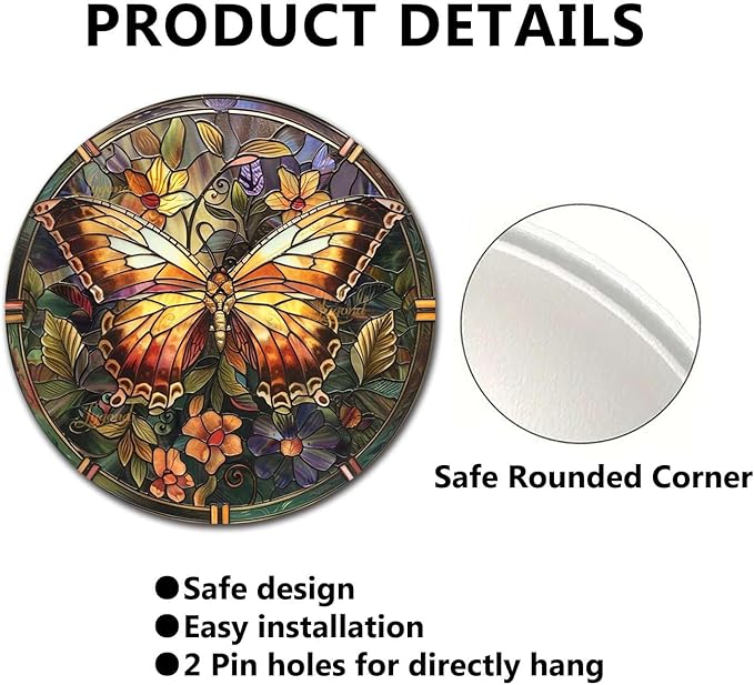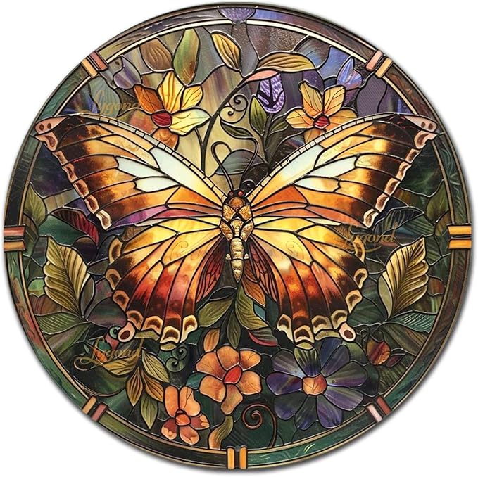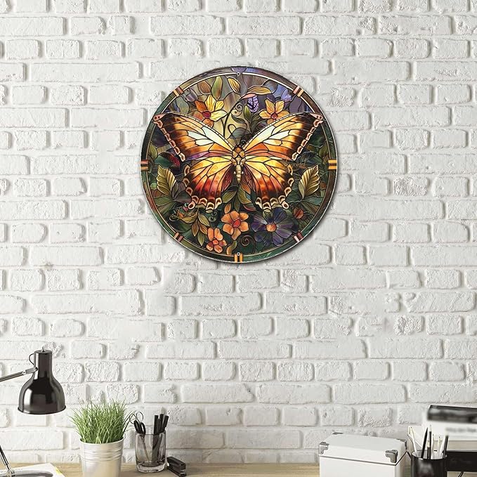 Lygond Metal Sign Tin Sign Circular Stained Glass Butterfly Funny Bathroom Decor for Garage 8×8 Inches