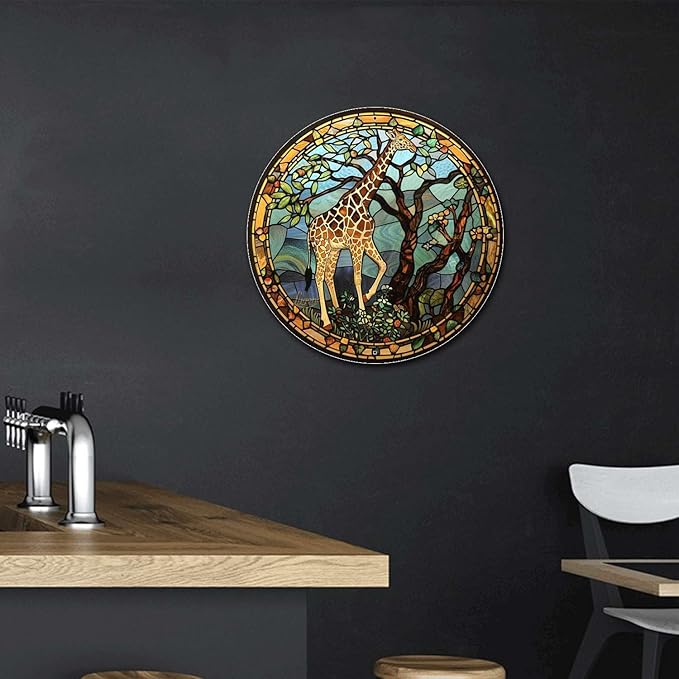 Lygond Metal Sign Tin Sign Circular Stained Glass Giraffe Bathroom Signs for Home for Gift 12×12 Inches