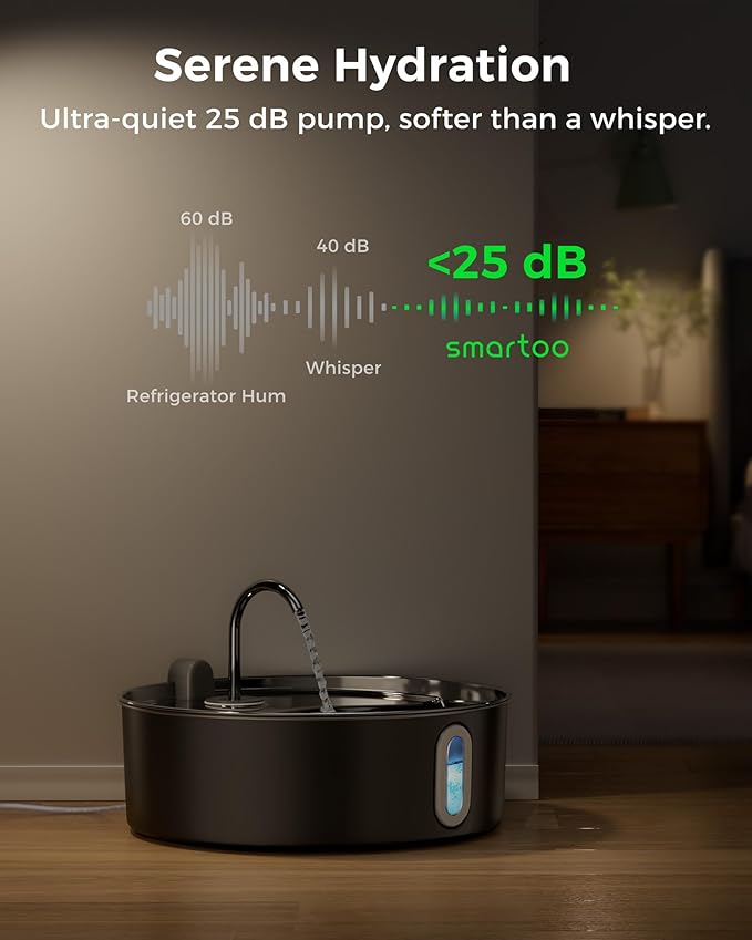 - Enjoy Peaceful Hydration - Our stainless steel pet fountain features an ultra-quiet pump that operates at just 25dB, which is softer than a breath and quieter than a whisper. It won't disturb your sleep, reading, or startle your pet
