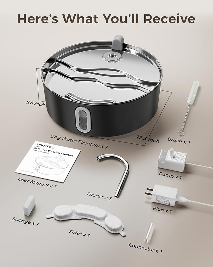 - Easy to Assemble and Clean - Crafted from durable 304 stainless steel, our Smartoo automatic water bowl features a simple design that's quick to assemble and disassemble—no tools needed, just 30 seconds! Plus, it's a breeze to clean, so you can spend more time enjoying with your pet and less time on maintenance