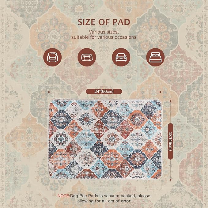 - 【Fashionable and Non-Slip】Our bohemian-print design adds a natural touch to the potty pads for dogs, giving your room a warm, casual vibe. And the non-slip bottom design makes the pet pee pads can achieve a certain fixed effect, you can put it anywhere you want. Soft and non-slip material makes it safer for dogs to use the pads.