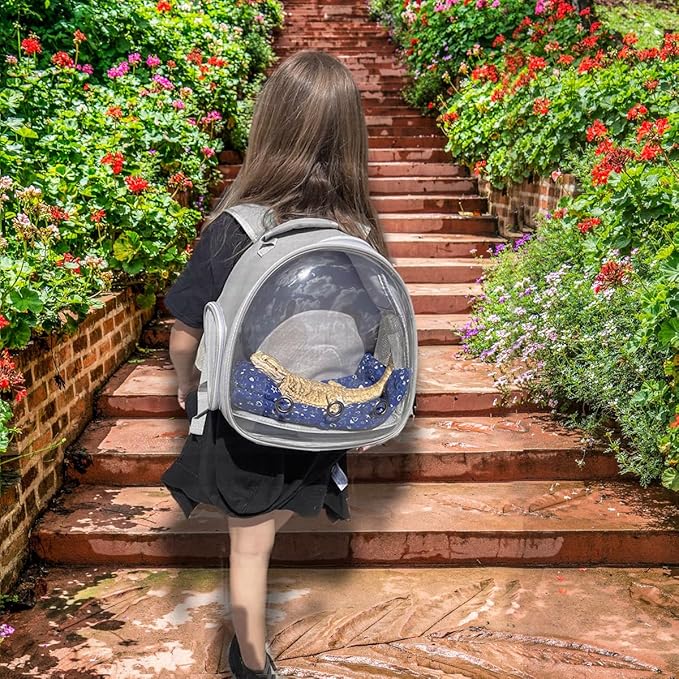 - Bearded dragon backpack carrier with leash and harness set has a big bubble Window. The front hard clear bubble window is better to protect reptile from crushing and attacking if accidents, it also provides a nice front view so they could check surroundings without anxiety.