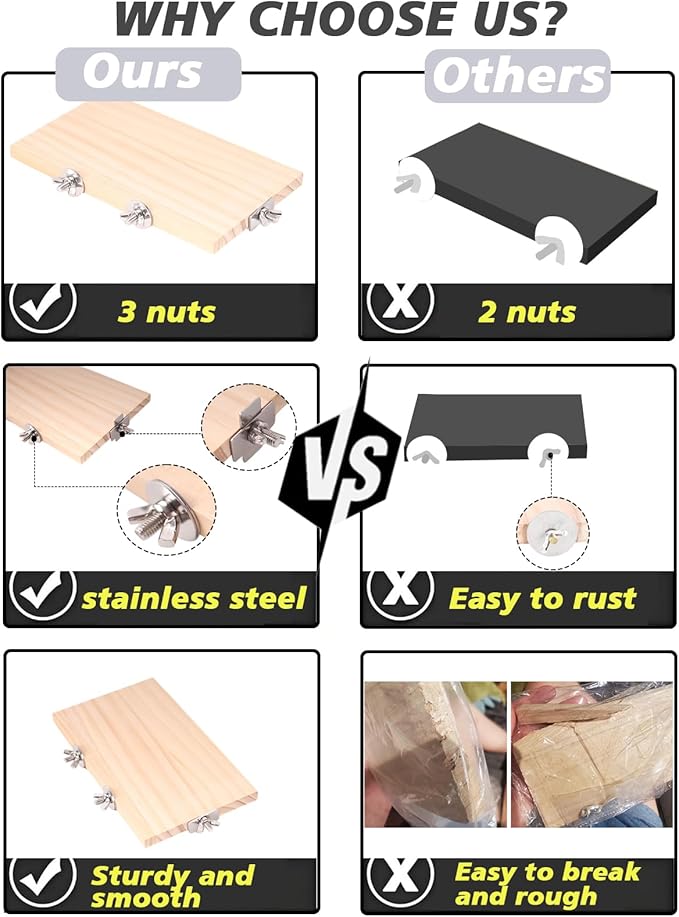 - Natural Material:The bird perch platform are made from 100% natural wood and stainless steel nut, our parrot cage perch surface polished smooth,safe and stable,nuts and washers are stainless steel for durability. Natural wood is suitable for birds to chew and eat, and it is a good place for birds to relax and entertain