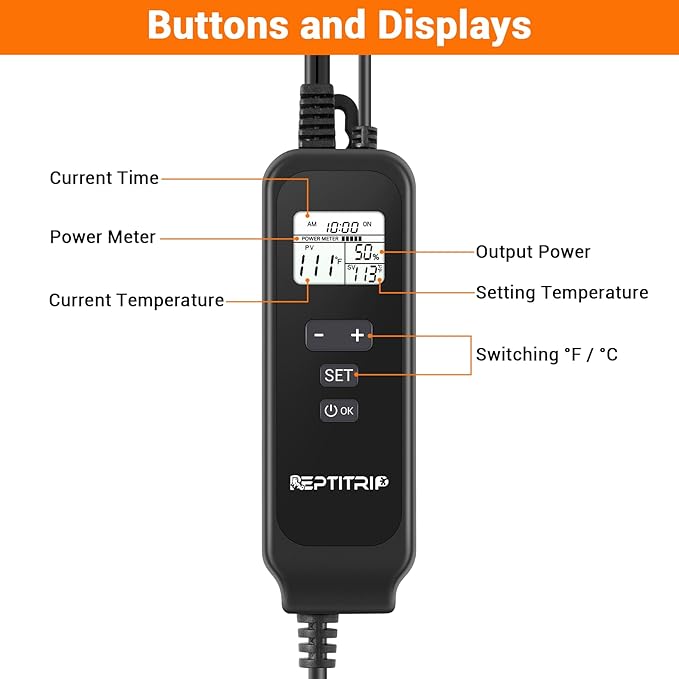 - Reptile Dimming Thermostat: Designed for controlling light and heat, the dimmable thermostat offers excellent stability and efficiency. It regulates light and heat output by adjusting power (non-switching type)