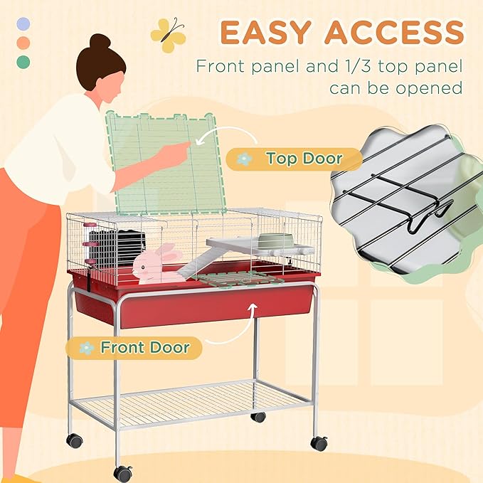 PawHut Two-Story Small Animal Cage Removable from Stand, Guinea Pig Cage with Shelf & Wheels, Pet Habitat for Hedgehog, Chinchilla, Ferret, 33" x 18.5" x 35", Red