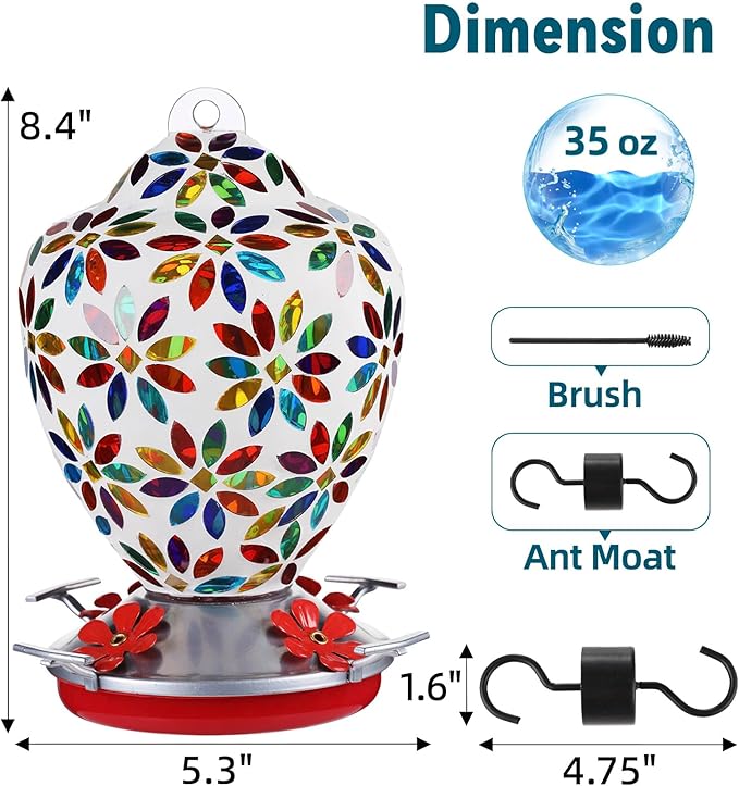 - ATTRACT MORE HUMMINGBIRDS. This handmade mosaic glass hummingbird feeders features a base of white with vibrant glass pieces in red, green, blue, yellow, and purple. Each glass mosaic piece resembles a petal or stamen, carefully arranged, and the bright colors mimic natural flowers, attracting hummingbirds from a distance. Watch these birds fly in flocks to your garden, creating a lively and charming atmosphere