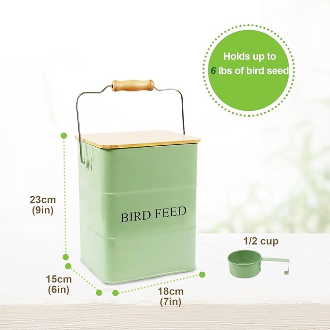 Metal Bird Seeds storage container,Outdoor Bird Food Container Canister, Pet Food Bin with Wooden Lid/Handle/Food scoop,hold 5-6 Lbs of Wild Bird Seed Sunflower Seed-Preventing Squirrels-Green