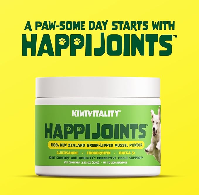 - Experience the Benefits of Green-Lipped Mussels, a natural source of 18 Omega-3 Fatty Acids, Glucosamine, and Chondroitin with HappiJoints: Providing essential daily support for your dog's hip and joint health. This effective and safe unique protein source helps alleviate arthritis symptoms and contributes to the maintenance of healthy joints, muscles, and agility.