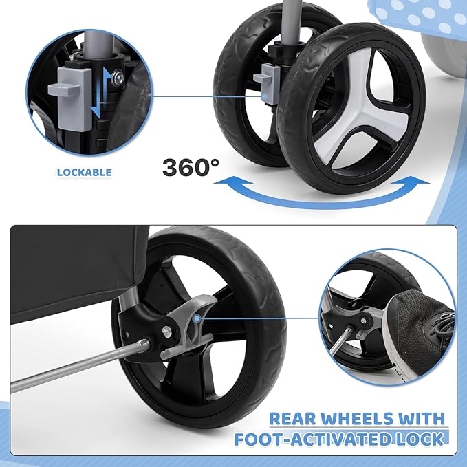 - Advanced Wheel Suspension, Braking & Safety System: Designed for stability, maneuverability, and control, our pet stroller features 360Β° swivel front wheels for effortless navigation, while the shock-absorbing rear wheels ensure a smooth, stable ride on various terrains. For added safety, the dual rear-wheel braking system provides a secure stop on slopes and uneven surfaces, giving pet owners peace of mind during strolls