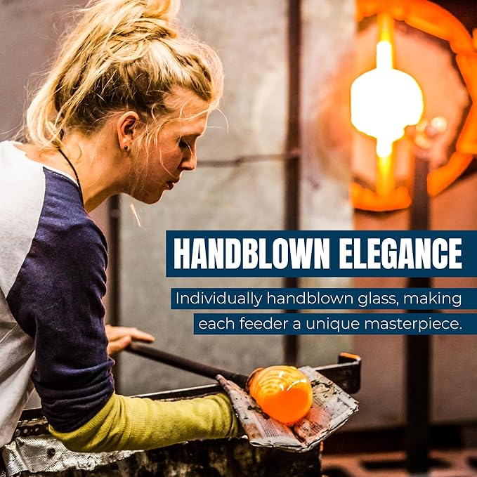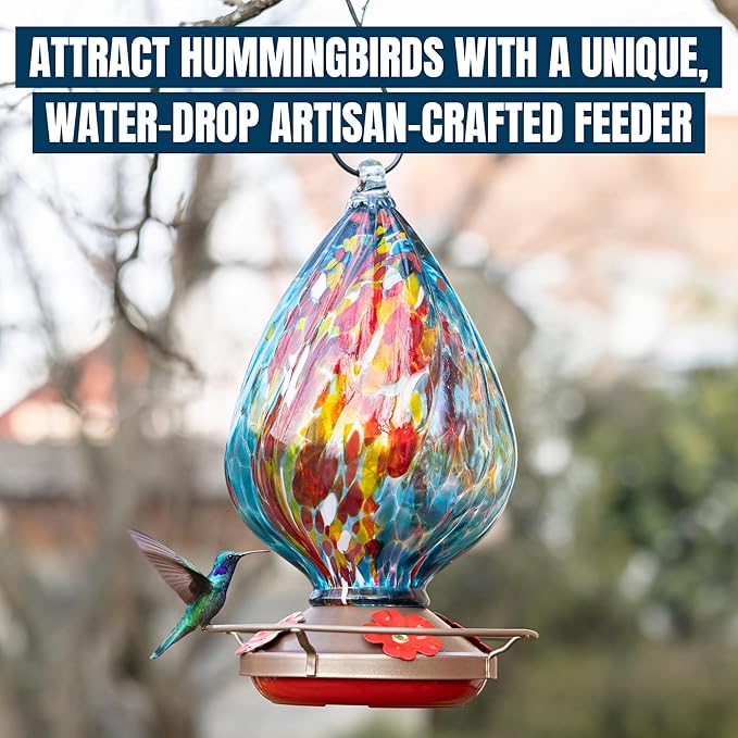 - BEAUTIFUL WATERDROP DESIGN – This hummingbird feeder glass is hand-blown with vibrant colors and a unique waterdrop shape. Perfect for adding charm to your garden, these hummingbirds feeders create a stunning display and attract hummingbirds, adding beauty and liveliness to your outdoor space. Beautiful glass hummingbird feeders for gardeners and bird lovers. Glass garden decor and backyard decor for outside. Garden art can attract more hummingbirds to your yard.