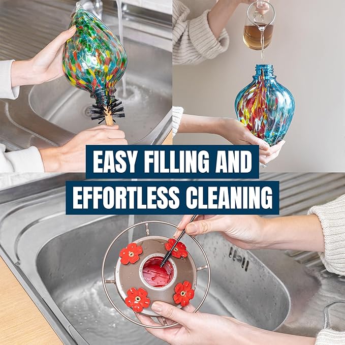 - DURABLE AND WEATHER-RESISTANT – Featuring an iron and plastic base, this glass hummingbird feeder is designed for durability and longevity. These glass hummingbird feeders for outdoors hanging are weather-resistant, ensuring they remain functional and beautiful through various outdoor conditions.