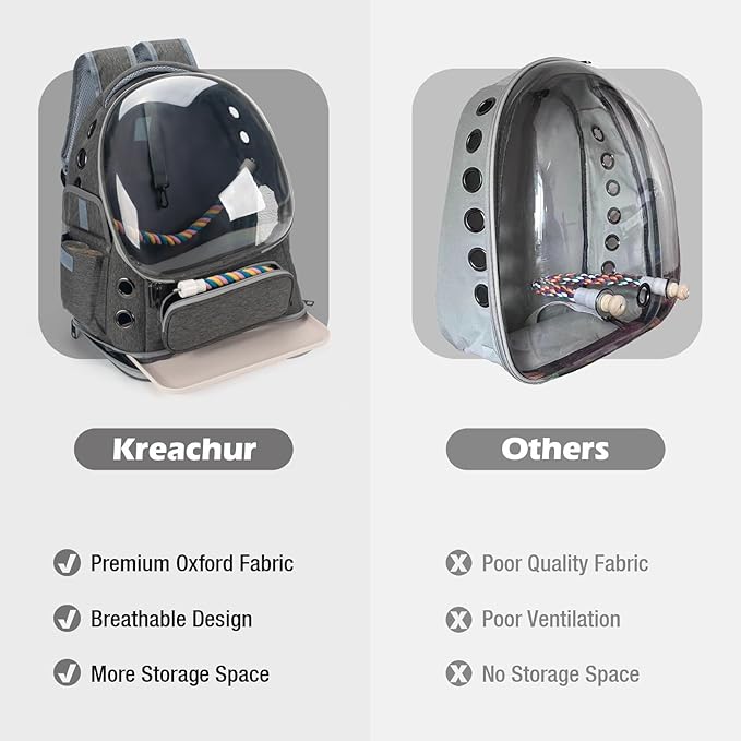 - BREATHABLE DESIGN: With large and more vent holes and mesh, Kreachur Pet Backpack Flight Cage provides optimal ventilation and airflow to your parrot. Front transparent window allows great scenery view while travel.