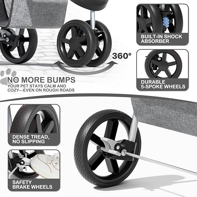 - Flexible Wheels - Finally, the 360° swiveling front wheel with a shock absorber ensures that your pet has a smooth ride even on the roughest terrain. The rear two wheels also feature brakes, making this stroller a perfect fit for injured or senior dogs or puppies that need a little extra TLC.