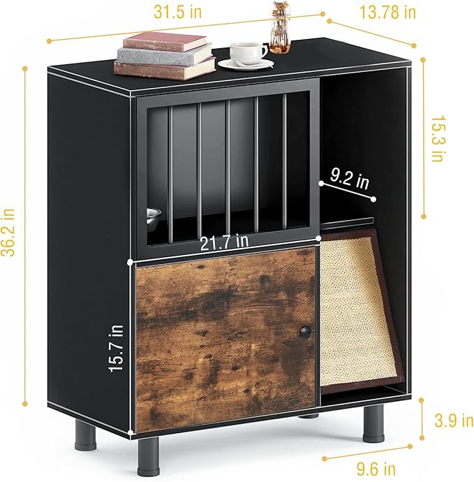 - Large space: above is the place to feed the cat, equipped with two stainless steel POTS, below are two lockers, can be placed cat food, the cat scratch board on the right can be opened to place some cat toys, cat cans and other small items.