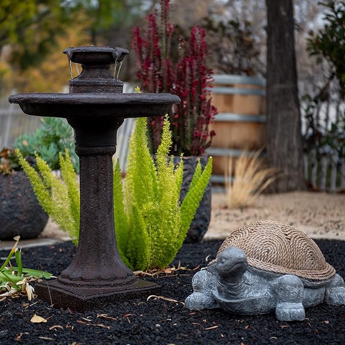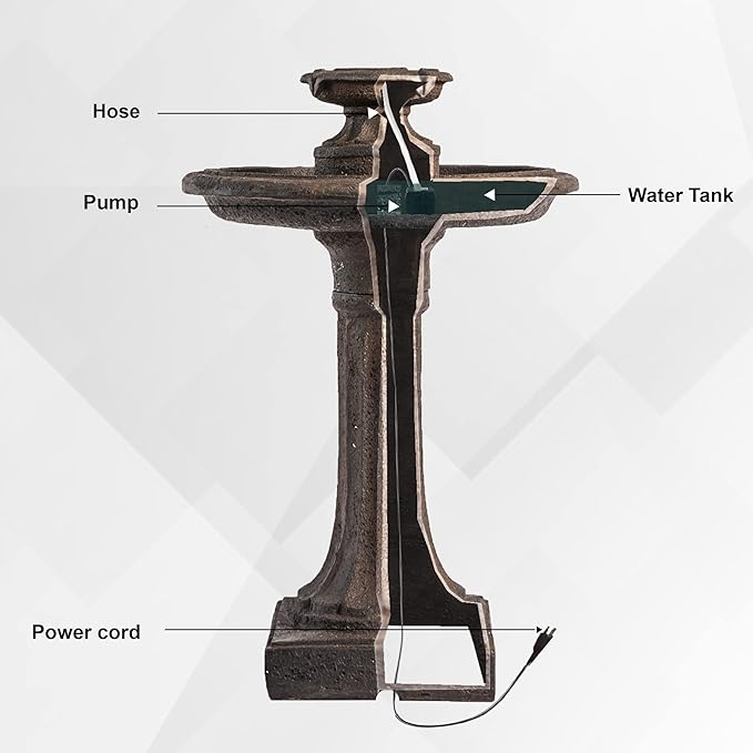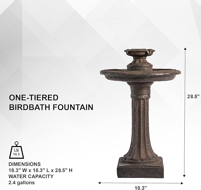 - ONE-TIERED BIRDBATH FOUNTAIN: Decorate your garden, patio, porch, deck or any outdoor space with this glamorous 1-tiered brown classic outdoor water fountain and create an inviting ambiance where everyone enjoys