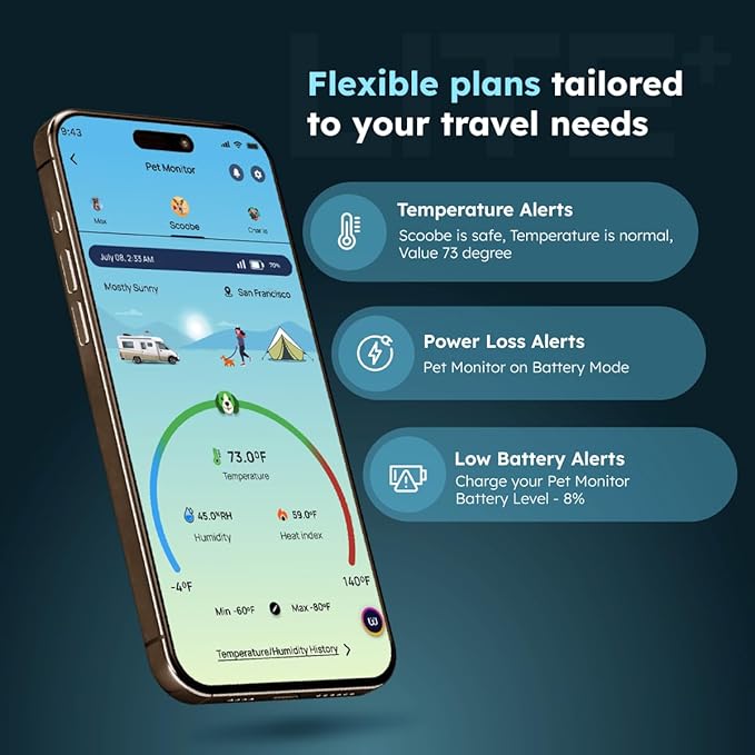 - ๐๐ญ๐๐ฒ ๐๐ฅ๐๐ซ๐ญ ๐๐ง๐ฒ๐ฐ๐ก๐๐ซ๐: Monitor RV temperature and humidity in real-time with instant alerts, ensuring your pet's safety while you're away.