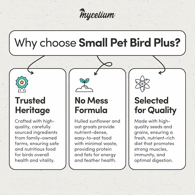 - Perfect for Small Pet Birds: Mycelium Premium Small Pet Bird Plus is specially formulated for Cockatiel, Parrot, Lovebird, and other small hookbills, delivering essential nutrients for vitality and health.