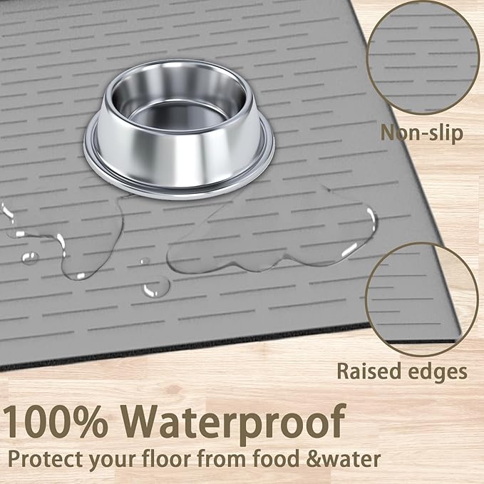 - 【Waterproof & Anti-Slip】: Silicone waterproof dog mat with precise structure, not easy to leak, to protect your floors. Non slip dog food mat have anti-skid function, prevent bowls from being moved or tipped over. The feeding mat for food and water can prevent floor from corrode and abrasion.
