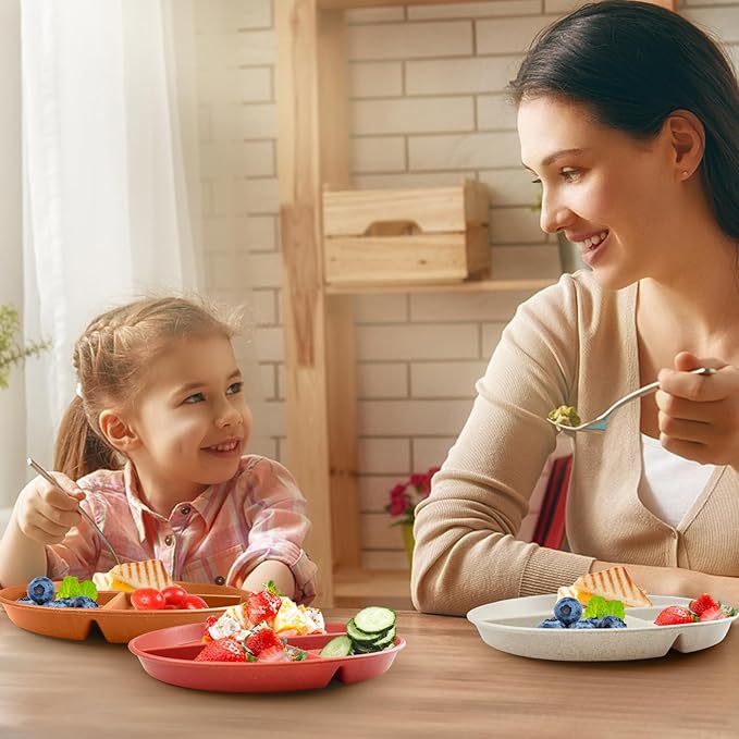 greenandlife 9 Inch 4PCS Unbreakable Portion Control Plates, Divided Plates for Kids Adults, Dishwasher & Microwave Safe Compartment Plate, Lightweight Reusable Wheat Straw Plate, BPA Free