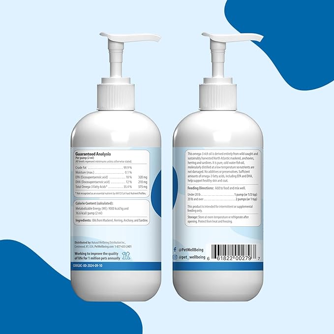 Pet Wellbeing Omega-3 Icelandic Fish Oil for Cats - Wild-Caught, Cold-Water Fish, Healthy Skin and Coat, Joint Health and Mobility, Fatty Acids, Anchovies, Sardines - EPA, DHA - 8 fl oz (236 ml)