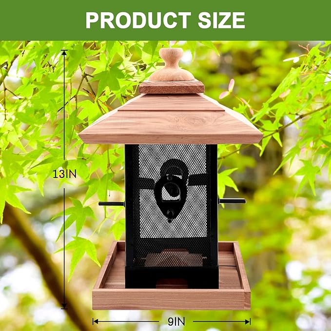 - [Large Capacity]: Our products measure 9x9x13 inches and can hold up to 2.8LB of birdseed, you can fill with a variety of birdseed to attract wild birds such as: sunflower seeds, peanuts, quinoa, corn kernels, etc. Each side of the feeder boasts a feeding hole, allowing birds to easily access the nourishment inside, complemented by a landing platform for comfortable feeding.