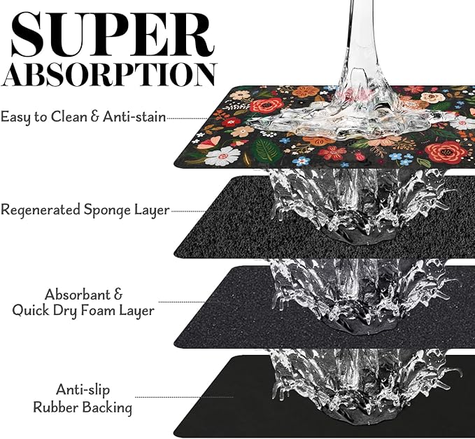 - Super Absorption: The diatomaceous earth dog mat for water bowl can absorb spilled water without leaving traces and dry quick, avoid wetting pet paws even for messy drinkers. And it does not attract pet hair like traditional silicone dog bowl mat.