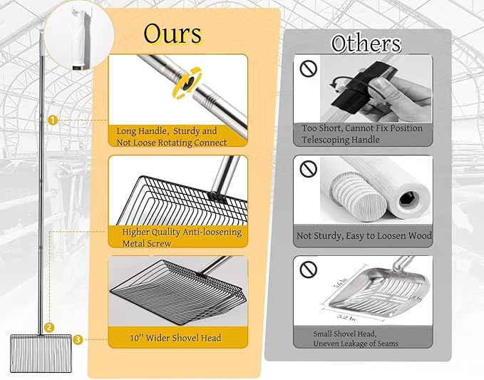 - Versatile 4-in-1 Design: Foandbevi chicken poop scooper is a game-changer in coop cleaning. With its 4-in-1 detachable design, it offers three adjustable lengths - 35", 48", and 63", reducing back strain during cleaning. Whether you're a chicken farmer maintaining a large coop or just cleaning up after a few backyard hens, this feature makes it a must-have chicken coop accessory. It's also useful as a general litter scooper, working great for cat litter or sifting sand on the beach