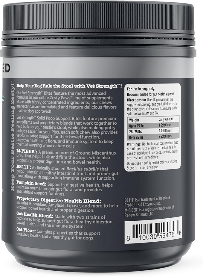 - Premium Fiber for Dogs to Help Their Poop - Each chew features M-FIBER, a premium form of Ground Miscanthus Grass that helps bulk and firm poo, while also supporting proper digestion and bowel health for doggy.