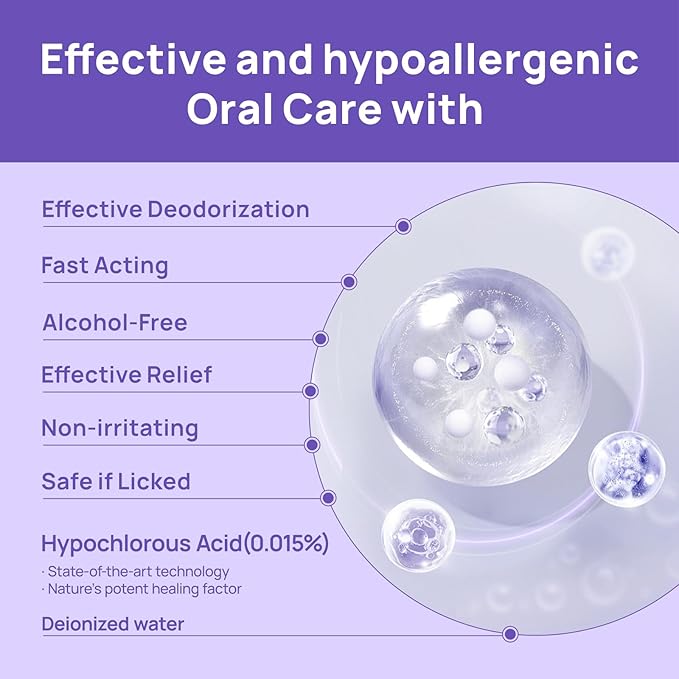 - Mild and Safe Ingredients. Formulated with a gentle lickable formula, the core ingredient is hypochlorous acid (0.015%), which is found in the white blood cells of all mammals and is a natural tool against foreign bodies. No-stinging, non-caustic, safe if licked or ingested, no need to worry about the loss of effect caused by licking.