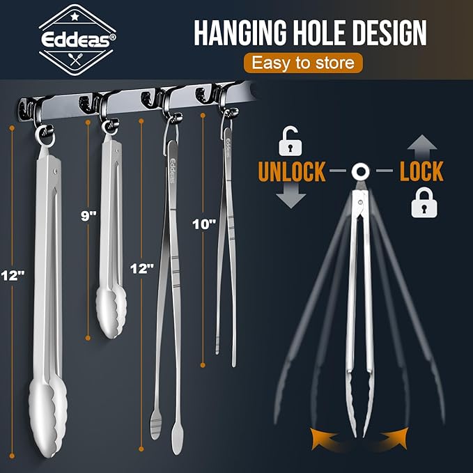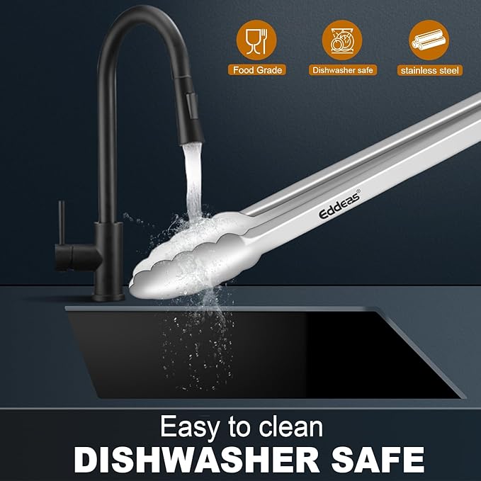 - FOOD-GRADE STAINLESS STEEL - Eddeas tongs for cooking & kitchen tweezers use food-grade stainless steel in one piece for enhanced robustness and heat resistance, rust resistance and easy handling. The overall light weight and ergonomic features are maintained.