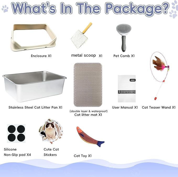 - Rich Accessories, Great Value: In addition to the litter scoop, filter mat, and anti-slip mat, we also include cat toys, a cat brush, and some cute cat stickers as a special gift. These practical and fun accessories not only enhance the value of the product but also provide more entertainment and grooming options for your beloved pet, bringing you and your cat more joy and convenience.