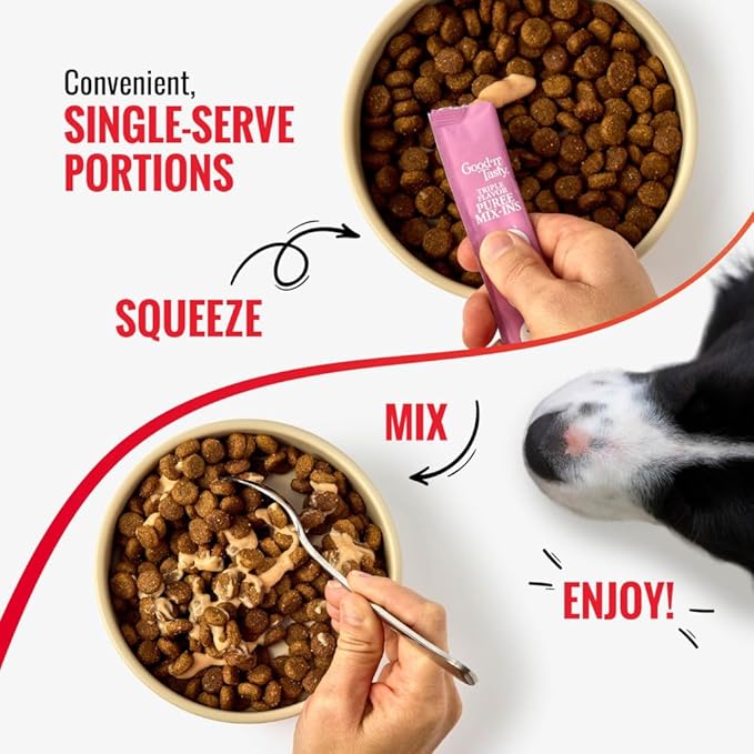 - DOG FOOD TOPPER TREATS: Good ‘n’ Tasty Triple Flavor Puree Mix-Ins enhance kibble’s taste and add flavor and protein to your pet's daily diet.