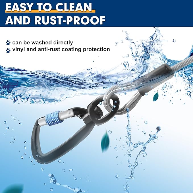 - High Strength and Secure Hook: The cable are equipped with a lockable clip, ensuring that your dog stays securely attached while enjoying freedom to roam. The innovative 360° rotating design prevents tangling, allowing your furry friend to move freely without getting stuck