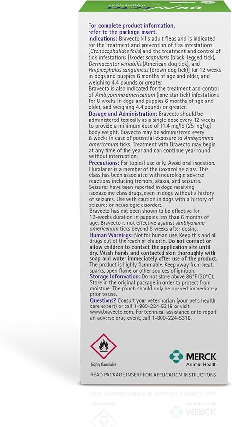 BRAVECTO Topical Solution for Dogs, Flea & Tick, 12 Week Supply, >22-44 lbs., Green Box