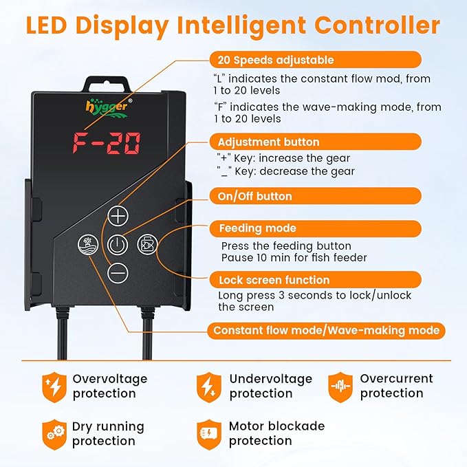 - LED Intelligent Controller: 1.Pumping mode 20 gears from small to large,display code is L-01 to L-20; 2.Wave-making mode,the frequency of the waves have 20 gears, from slow to fast,display code is F-01 to F-20; 3.Feeding Mode, Press the feeding button. Pause 10 min for fish feeder.4.Lock screen function, Long press 3 seconds to lock/unlock the screen.