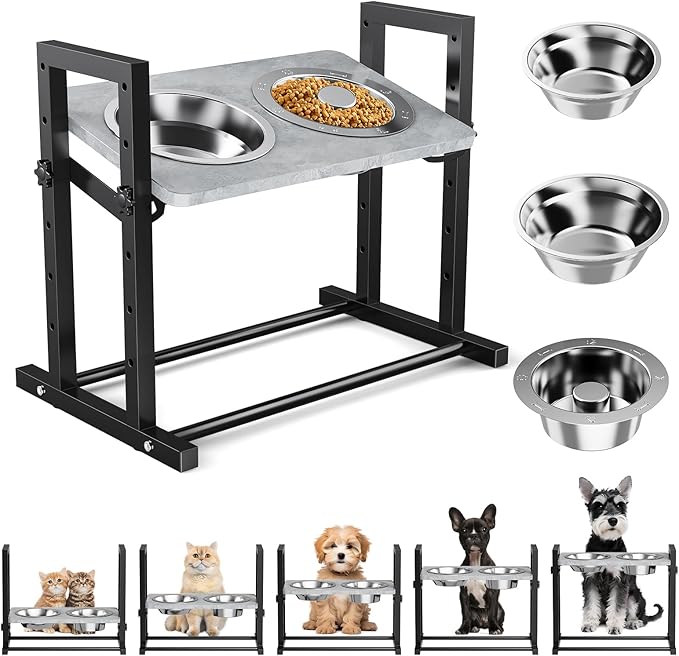 Elevated Dog Bowls for Dogs, 6 Heights Adjustable Raised Dog Bowl with Slow Feeder - 3 Stainless Steel Bowl, Tiltable Non-Slip Feeding Bowls with Metal Stand