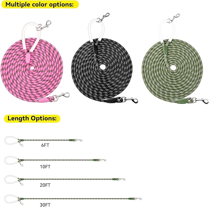 - Length design to adapt to various scenarios: 6 feet, 10 feet, 20 feet, 30 feet. Various sizes can meet different training purposes. Suitable for outdoor sports such as hiking, camping, training, hunting, backyard, beach, climbing, walking, running, etc. Now you can take your pet on all kinds of adventures.